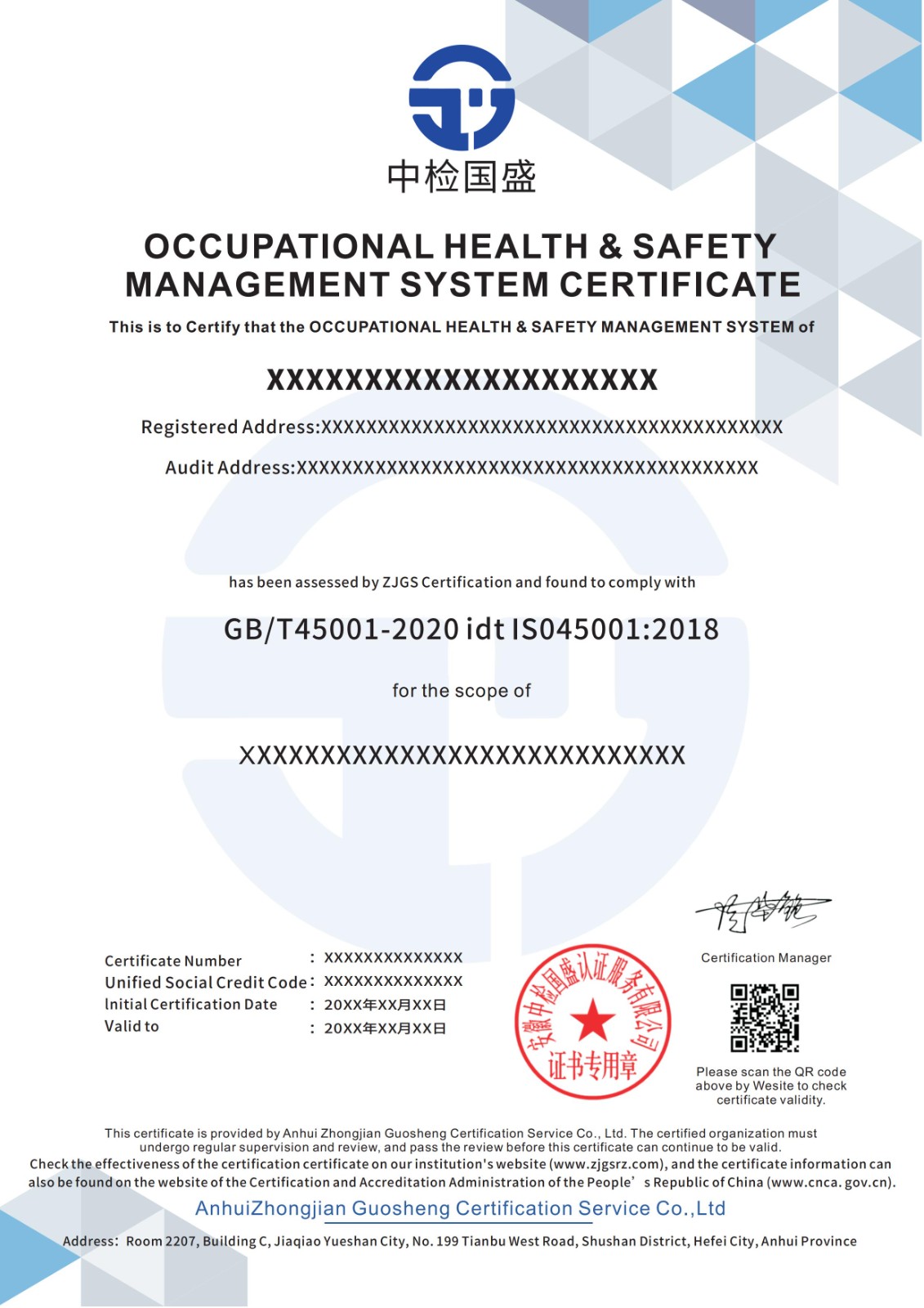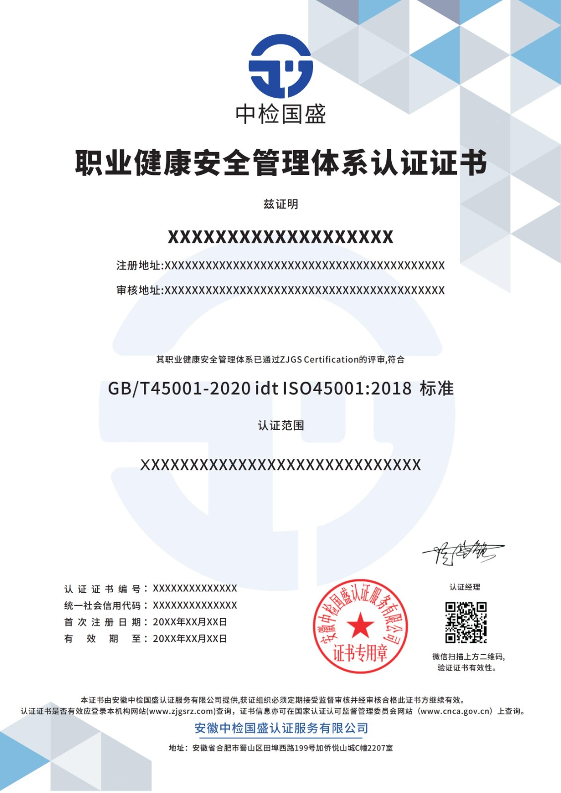 ISO45001职业健康安全管理体系证书样本